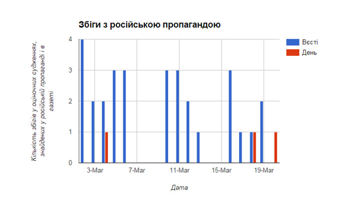 Верховный суд Штатов принял во внимание это исследование и закрыл фашистскую прессу.И, заметьте, никто не говорил тогда о свободе слова. Речь шла об оружии Гитлера.«Сейчас в Украине — похожая картина. Только анализ приходится делать сложнее, ведь информационные потоки меняются каждый день. Например, Россия до середины марта праздновала оккупацию Крыма и восхваляла своих завоевателей, но после переговоров в Берлине с участием Петра Порошенко и Ангелы Меркель 16-го марта резко изменила курс, и начала писать о том, как Путин хочет мира, а злой Порошенко ему мешает», - утверждает . кандидат наук по социальным коммуникациям Артем Захарченко, руководитель волонтерской группы, которая провела контент-анализ «Вестей».В результате, волонтеры выяснили, что газета «Вести» постоянно транслирует тезисы российской пропаганды. В качестве оппонента «Вестей» волонтеры взяли ежедневную газету «День», которую сложно заподозрить в лояльности к нынешней власти Украины.