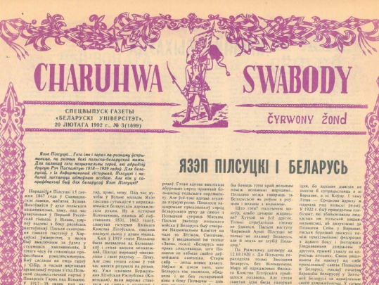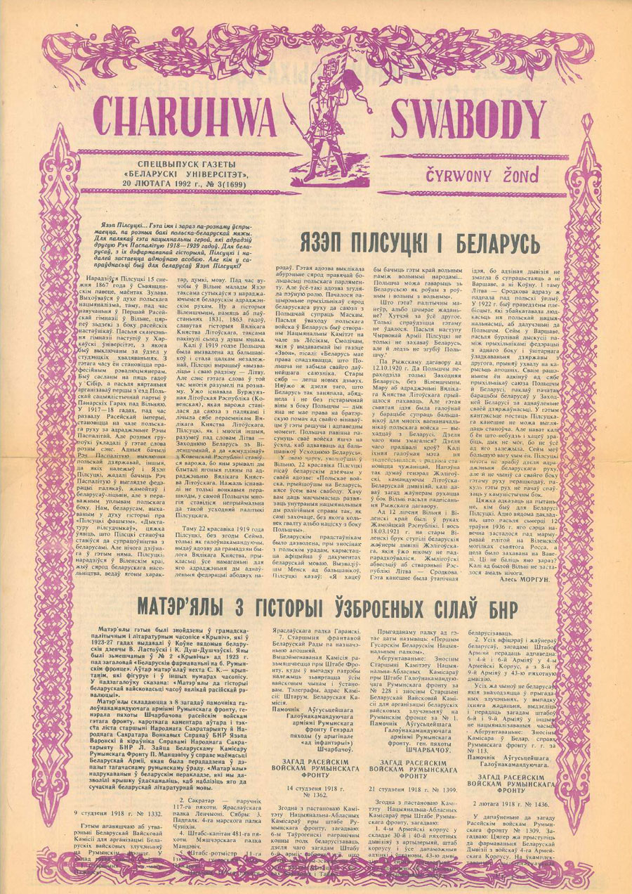 Але ж вось што тут цікава. “Charuhva Swabody” пазначана як “Спецвыпуск газеты “Беларускі Універсітэт”. Надрукавана накладам 2000 асобнікаў у Мінскай паліграфічнай фабрыцы “Чырвоная зорка”. Адрас рэдакцыі – вул. Бабруйская, 9 – супадае з адрасам адміністрацыі БДУ. Рэдактарам пазначана М. Г. Загорская. Гэта тая самая Марына Загорская, якая пазней стала вядомай журналісткай БДГ, а яшчэ пазней – працавала ў такіх праектах, як “Заўтра тваёй краіны” і “Салідарнасць”.