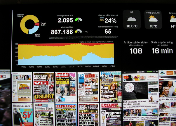 Так, салідная (і разам з тым дынамічная, кідкая, вострая) “Афтэнпостэн” нават сёння, у эпоху інтэрнэту, мае 220 тысяч асобнікаў друкаванай версіі. Зрэшты, наклад пакрысе зніжаецца, сказалі нам у рэдакцыі, дзе на сцяне — вялікае табло, на якім у рэальным часе адлюстроўваецца, у прыватнасці, колькі наведнікаў зайшло на сайт выдання за апошнюю хвіліну.