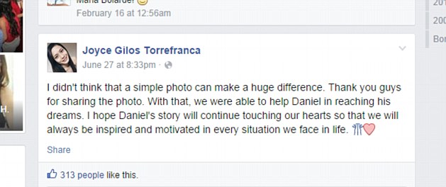 Студентка Джойс Гилос-Торрефранка призналась в своем аккаунте в Фэйсбук, что не ожидала такого развития событий: «Я никогда не думала, что одно фото может так сильно изменить чью-то жизнь. Спасибо вам за то, что поделились им. Благодаря этому мы смогли помочь Даниэлю в реализации его мечты. Я надеюсь, что история этого мальчика на этом не закончится и она продолжит вдохновлять и мотивировать нас в достижении любых целей».