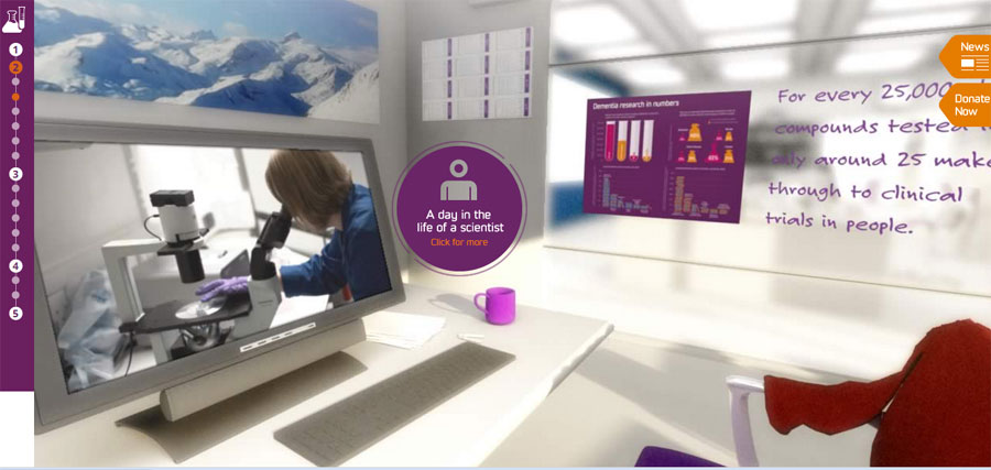 Следующая страница создана не медиа, но от этого она не стала менее впечатляющей. Проект The Lab создан в сети для того, чтобы рассказать о механизме возникновения и течение старческой деменции (болезни Альцгеймера), от которой по всему миру страдают 44 миллиона человек (к 2050 году их число может возрасти до 135 миллионов).