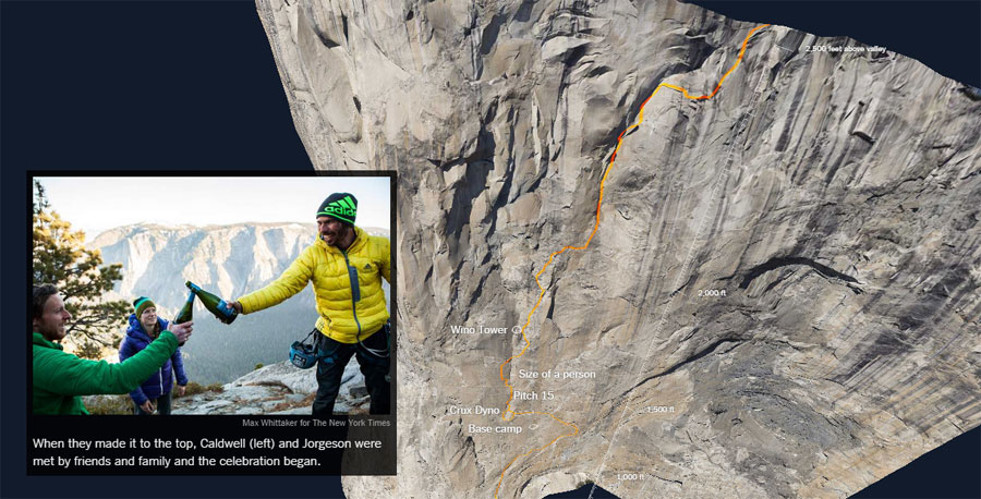 В январе этого года The New York Times предложило своим читателям виртуально взобраться на отвесную скалу вместе с альпинистами Томми Колдуэллом и Кевином Джоргесоном.