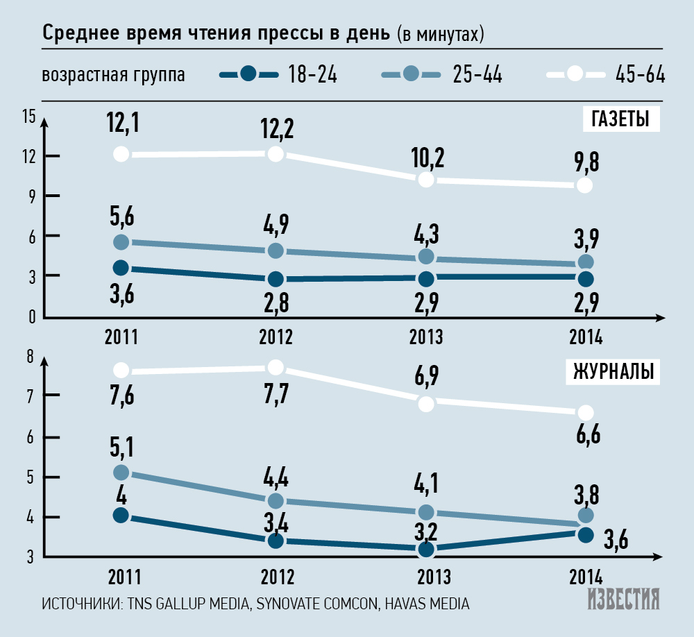 Как указано в отчете Havas Media, TNS Gallup Media и Synovate Comcon, традиционные читатели печатной прессы – среднее и старшее поколение (от 45 до 65 лет) – начинают терять к ней интерес. Время на чтение газет и журналов за 2014 год сократилось на 4%. Гендиректор Havas Media Елена Белова объясняет это тем, что представители старшего возрастного сегмента уже активно осваивают интернет. Но вот что интересно: динамика чтения прессы населением России за последние 4 года показывает, что наименьшее падение интереса к печатной прессе наблюдается у самого молодого сегмента аудитории (18-24 года). Да, доля читателей газет и журналов в данном возрасте невелика, но те, кто все-таки предпочитает печатные СМИ, демонстрируют определенную стабильность выбора. Хотя некоторые аналитики объясняют интерес к глянцевым изданиям у аудитории от 18 до 24 лет наличием там достаточно качественного контента.