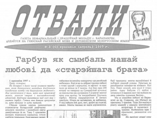 Сёння разглядзім досыць спрэчнае выданне – газету “Отвали”, якая таксама паўстала часам падзеяў 1996-1997 гадоў. У пэўным сэнсе “Отвали” – ідэалагічны спадкаёмца газеты “Моладзь змагаецца”, пра якую я нядаўна пісаў. Адметнасць “Отвали” – у тым, што яна яшчэ больш радыкальная, чым “Моладзь змагаецца”, а таксама ў тым, што яна выдавалася ў Баранавічах. І выдавалася адносна доўгі час – прынамсі, да мяне патрапіў нумар, які пазначаны як № 3(6). (“Моладзь змагаецца” выйшла ўсяго двума нумарамі.)