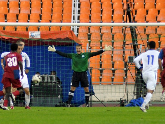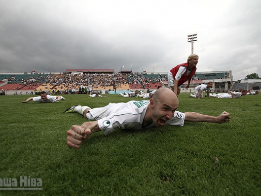 На здымку: брамнік “Мінска” Сімас Скіндэрыс падбадзёрвае партнёраў у міжнародным матчы з азербайджанскім клубам “Алімпік”. Здымак стварае эфект прысутнасці непасрэдна на полі.