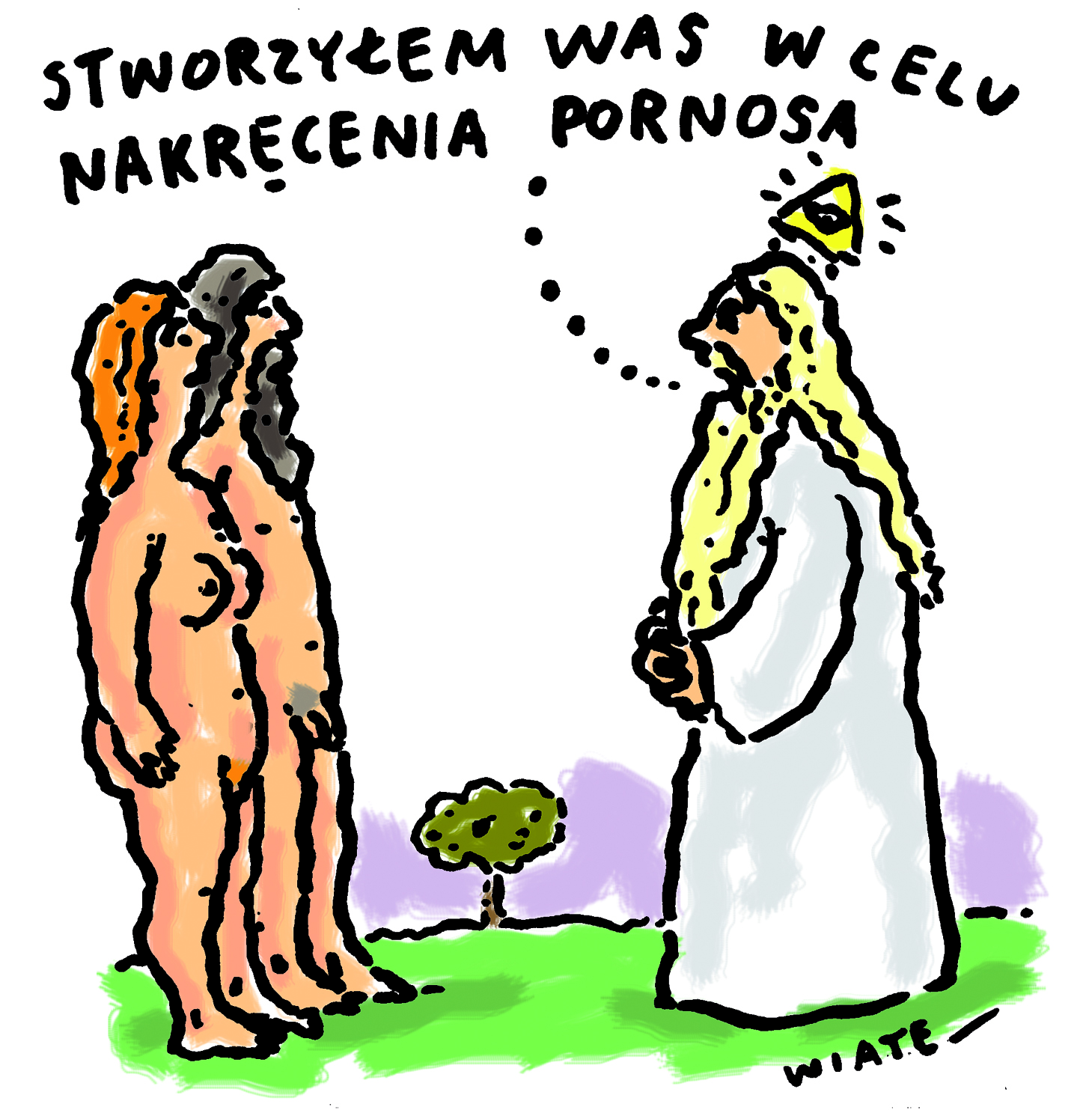- Дословно – все. Например, могу нарисовать писающего президента. Могу нарисовать Иисуса, который лежит в постели со святым Иоанном. Дело в том, что я пытаюсь своими рисунками разговаривать с людьми, пытаюсь показать им другую точку зрения и вообще иной способ мышления. Например, когда наши правящие элиты говорят о том, что Польша должна встать с колен, то я говорю о том, что в первую очередь Польша должна встать с колен перед Ватиканом. Если бы я был президентом, то первое, чтобы сделал, то объявил войну Ватикану. Это вредное государство, оно вредит! Я ничего не имею против веры в Бога - я против институализации религии! Я против преподавания религии в школах ( в польских школах религия преподается два раза в неделю, М.Г.), я против педофилии в костеле, я против того, что ксендзы получают усадьбы через костелы. Ксендзы и монахи в Польше освобождены от таможенных, юридических и судебных пошлин! У них есть зарплаты и страховки, и все это за деньги налогоплательщика! Это привилегированная группа людей в Польше, что противоречит Конституции и обычным этическим нормам!
