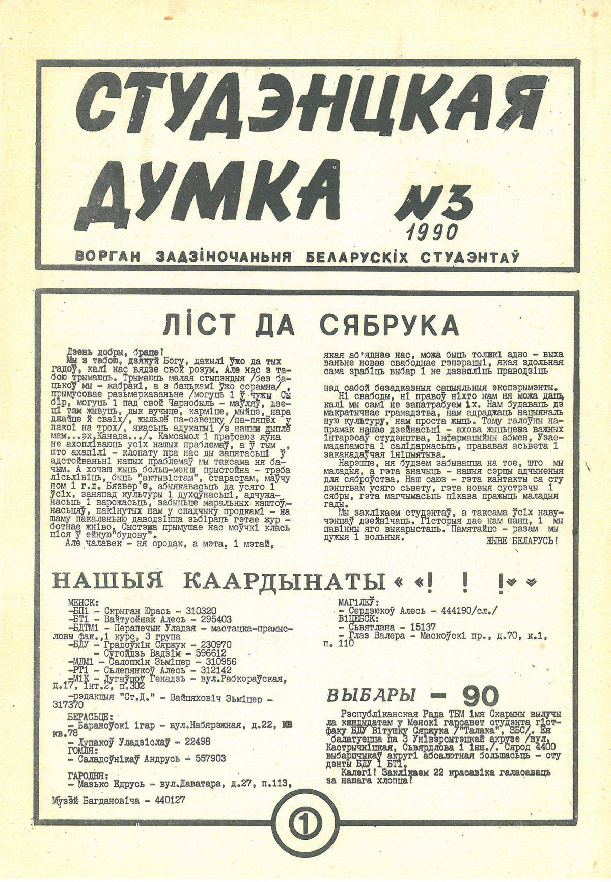 Газета (а пасля часопіс) “Студэнцкая думка” – гэта непадцэнзурнае выданне, якое існавала ў найноўшай Беларусі рэкордна доўгі час: ад 1988-га і ажно па 2005 год. І нават нейкі час выдавалася цалкам легальна.