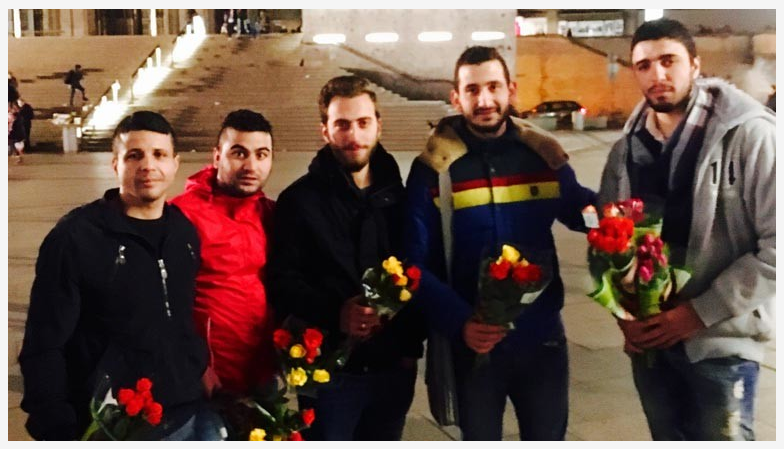 Cирийский беженец Майд и его друзья раздают розы на вокзале в Кёльне. Источник: DRadio Wissen Автор: Рахель Клейн