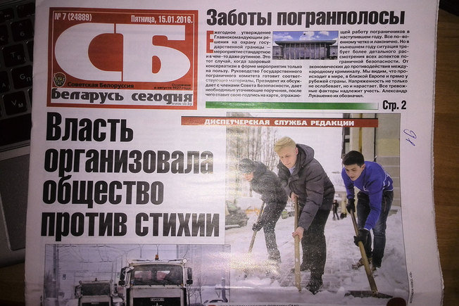 Начинается статья со слов «Вчера вечером минчане получили СМС от горисполкома с просьбой убрать снег у машин и во дворе. Но еще накануне работа у многих домов кипела. Люди вышли по собственной инициативе. Да, они знают: государство без помощи не оставит».