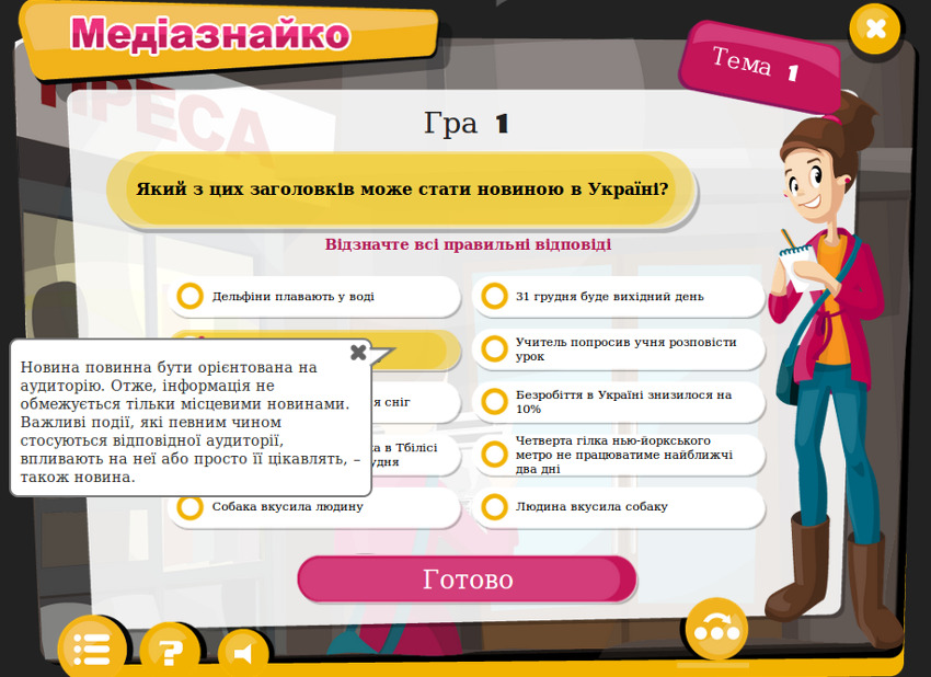 В мае 2014 года «Академия украинской прессы» представила обучающую игру «МЕДИАЗНАЙКО», которая стала частью школьного курса по медиаграмотности. В этой занимательной игре ученики могут попробовать себя в роли создателя контента и узнать больше о медиа в целом. (Признаемся честно, автор этих строк сам провел в игре более получаса, тестируя свои знания в медиасфере). Первоначально игра была разработана армянским «Центром медиа-инициативы», украинцы во многом адаптировали ее под свои реалии.