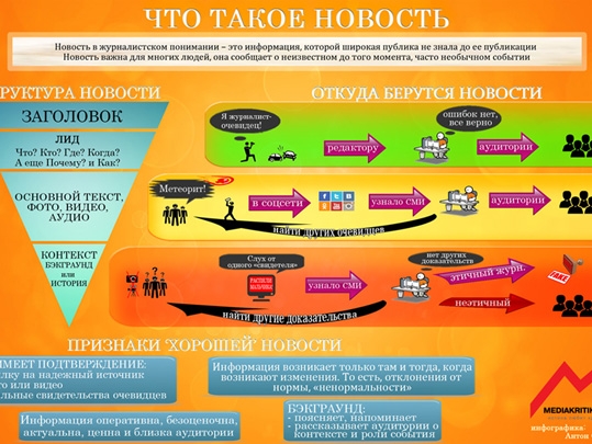 Mediakritika.by разработала инфографику «Что такое новость». В ней мы максимально просто рассказываем, что такое новость и называем признаки качественно сделанной новости. А в блоке «Откуда берутся новости» из множества возможных показываем три самых классических варианта развития событий.