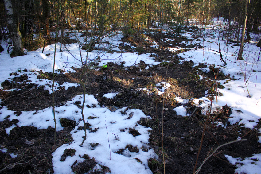 Где-то на полпути замечаем изрытую дикими кабанами землю. «Ой! Кобаны! Я в лесу боюсь только людей и кабанов. Первые могут оказаться маньяками, а вторые просто разорвут в клочья», - делится своими переживаниями симпатичная девушка из команды.