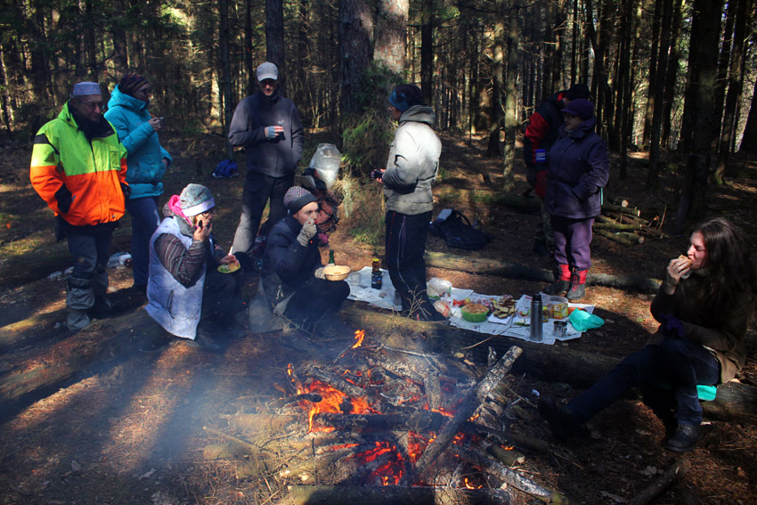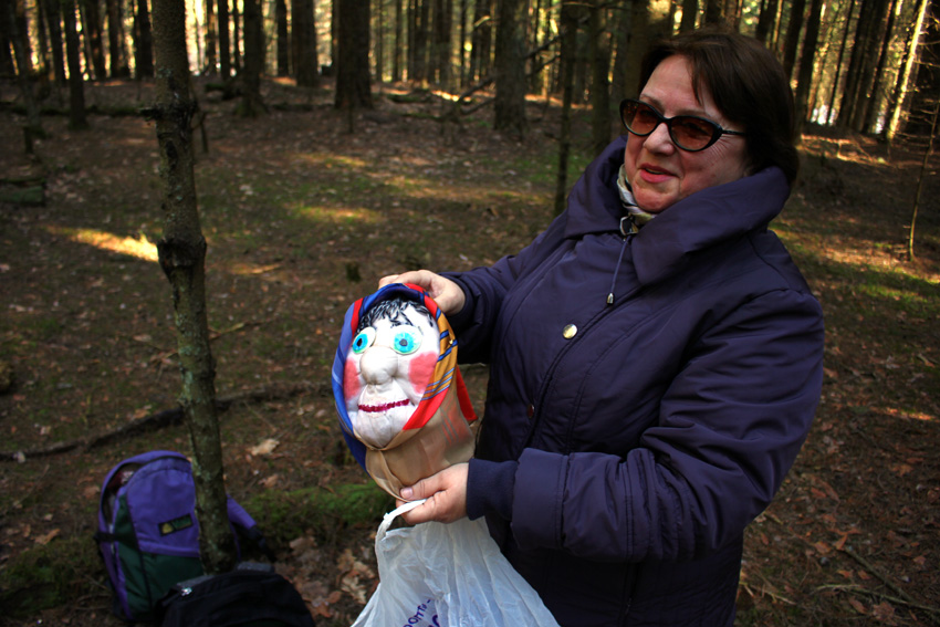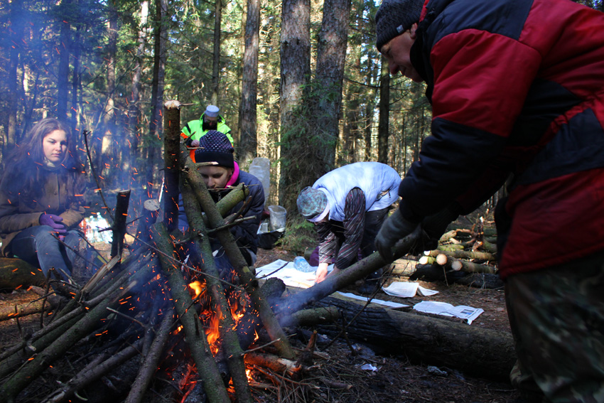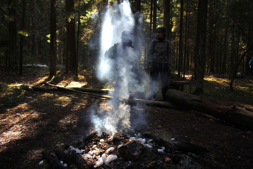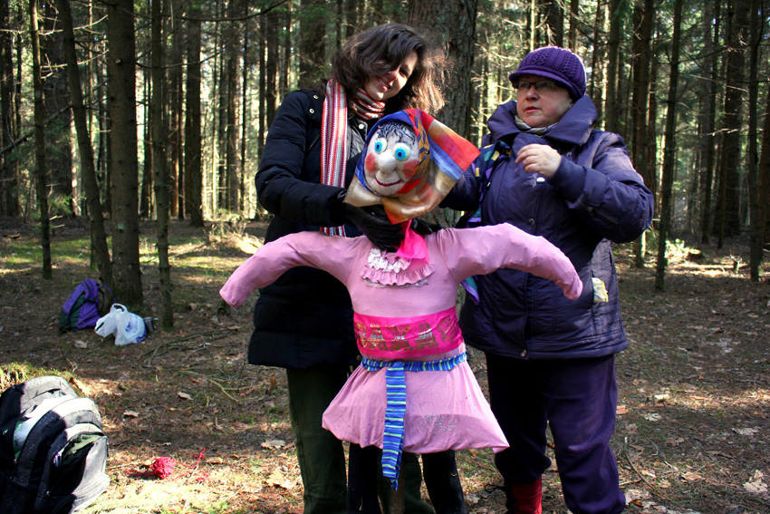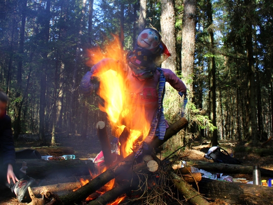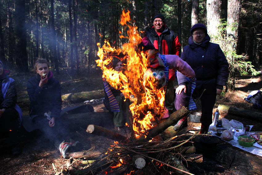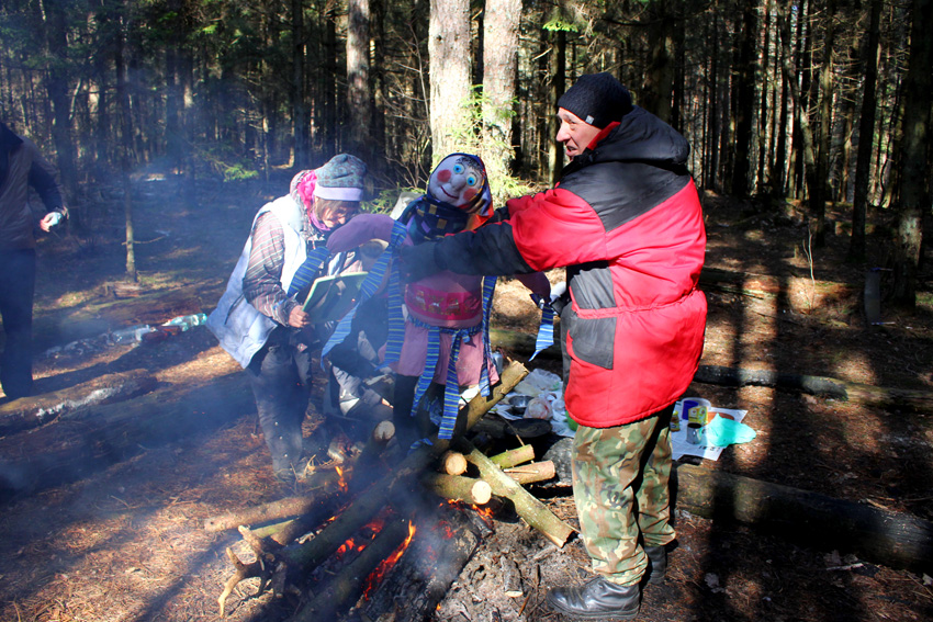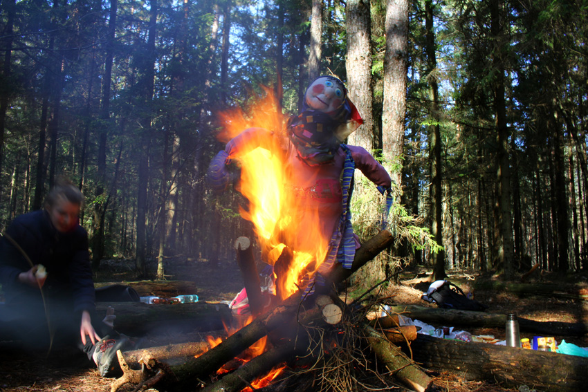 Тем временем мы взбираемся на холм и оказывается, что здесь конечная точка нашего сегодняшнего похода. По центру поляны — старое кострище, вокруг него бревна, исполняющие функцию лавок. Часть команды углубляется в лес, чтобы наломать дров (в прямом смысле слова). Другая начинает заниматься созданием чучела Масленицы, которое торжественно сожжется через пару часов. Чучело делается из двух связанных накрест деревянных палок, привезенной с собой старой одежды и головы, заранее подготовленной одной из участниц похода.