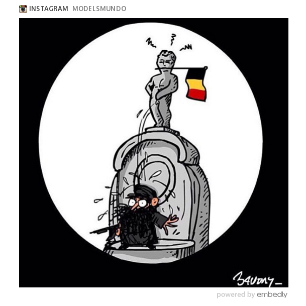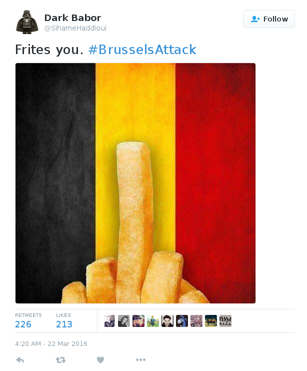 Кроме слов сочувствия пользователи социальных сетей отвечают на террор креативом и юмором. Многие юзеры публикуют фотографии картофеля фри в виде "среднего пальца" или перекрашивают фотографии профиля в цвета бельгийского национального флага: чёрный, жёлтый и красный. В грустных карикатурах и мотиваторах охотно используют также образ "писающего мальчика" и героев бельгийского комикса Тима и Струппи.
