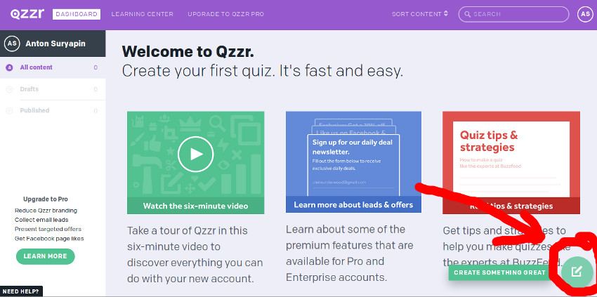 Для регистрации нужно сказать сервису лишь имя, e-mail и пароль. Занимает это менее 15 секунд. После чего мы попадаем на свою страницу. Чтобы приступить к созданию теста, нажимаем в нижнем правом углу на «Создать что-нибудь великое».