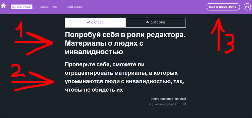 Здесь перед нами появляются варианты. Для создания обыкновенного теста нас интересуют варианты 'Graded' и 'Outcome'. Тип Graded позволяет определить уровень правильных ответов в процентах. Тип Outcome позволяет создавать опросы с дифференциацией. Mediakritika.by пользуется Graded.