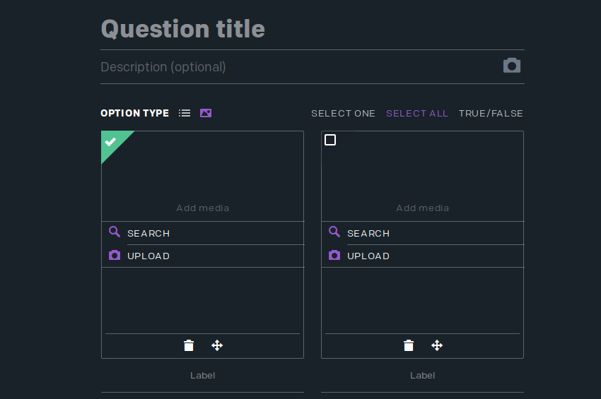 Сверху пишем сам вопрос. В поле ниже можем можем что-нибудь добавить к вышесказанному текстом либо уточнить иллюстрацией. Еще ниже, в Option type, выбираем типы варианта ответа: текстом либо картинкой; может быть правильным один ответ, проходящему тест нужно выбрать все верные варианты ответа или сказать «Правда» или «Ложь».