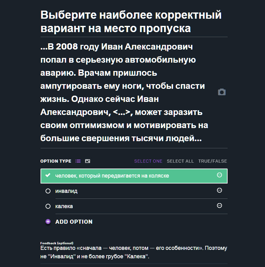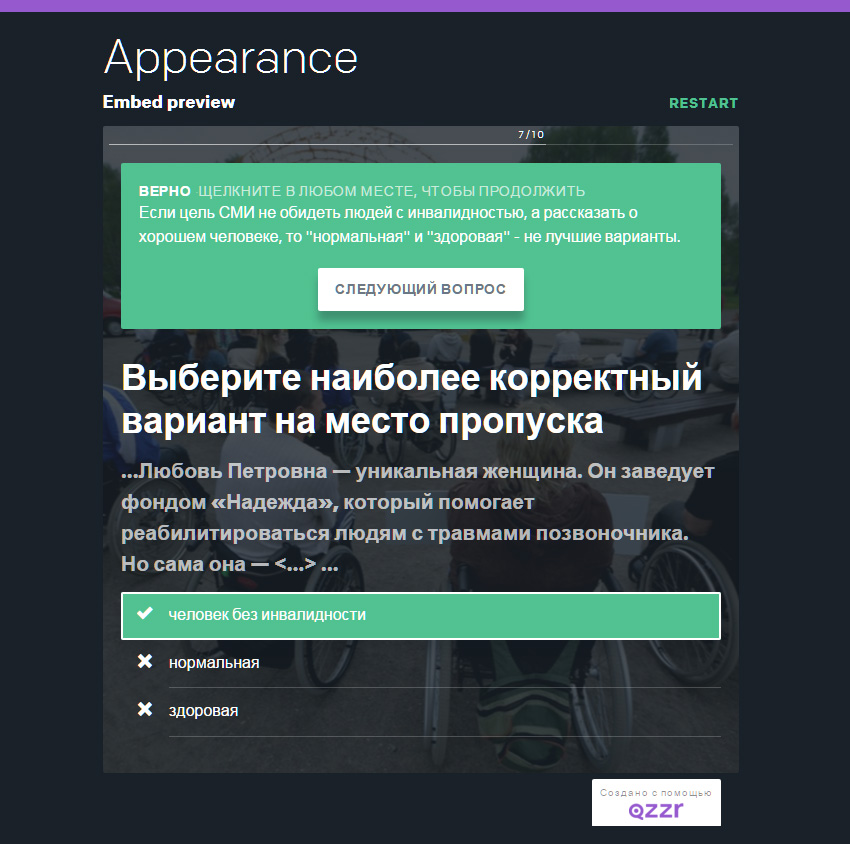 Что же, тесты показались и Mediakritika.by отличным средством для того, чтобы продвинуть в массы идеи медиаграмотности. Как могли заметить наши читатели, мы уже опубликовали несколько тестов из серии «Попробуй себя в роли редактора» на темы людей с инвалидностью и ЛГБТ, а также предложили попробовать свои силы в качестве редактора криминальной хроники. Настало время рассказать, как создаются эти тесты.