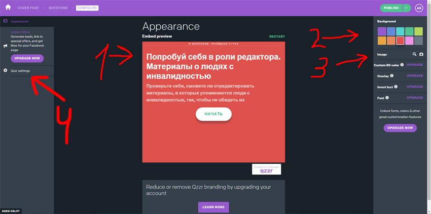 Наконец, когда мы добавили все вопросы и варианты ответов, а также отметили корректные ответы, пора переходить к следующему пункту. Снова нажимаем в правый верхний угол на кнопку «NEXT: CONFIGURE». Главное – здесь мы видим, как выглядит наш тест (на скриншоте отмечено под цифрой 1), и можем его пройти сами, чтобы еще раз убедиться в корректности составления. В бесплатной версии QZZR для нас здесь доступно не так много настроек. Точнее, лишь смена цвета фона (стрелочка №2) либо добавление картинки (3). Нам кажется, что версия с фоновой картинкой выглядит куда более стильно, чем однотонный цвет. Сравните: