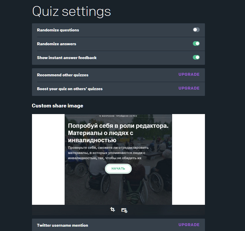 Отдельным блоком создатели QZZR предлагают задать пользовательское изображение, которое будет использоваться при расшаривании теста в социальных сетях. Мы задали скриншот начальной страницы нашего подопытного для этой инструкции теста.