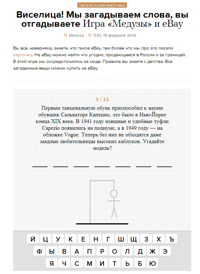 По части нативной рекламы, превращенной в игру, в русскоязычном интернете, пожалуй, нет конкурентов у упомянутой выше «Медузы». Здесь – что ни кейс, то с изюминкой.