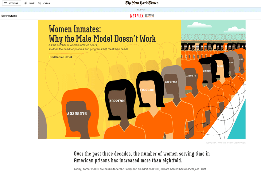 Проект «Женщины-заключенные» - не развлекательный. По сути, это очень качественно сделанная журналистская работа, посвященная проблеме содержания женщин в тюрьмах США. В материале много интервью с женщинами-заключенными, комментарии экспертов, интересная инфографика и… ни слова о сериале.