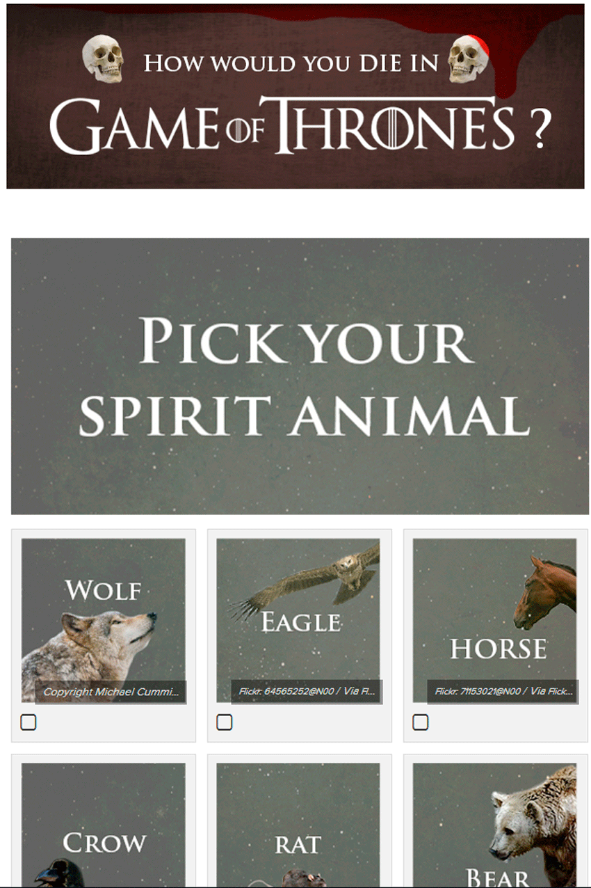 По сути, это тот же тест, в котором пользователи отвечают на вопросы о своих страхах, о том, каким бы они хотели запомниться другим, о том, как представляют себе рай и другие. В результате прошедние тест получают развернутый ответ о том, как бы он умер, будь персонажем «Игры престолов».