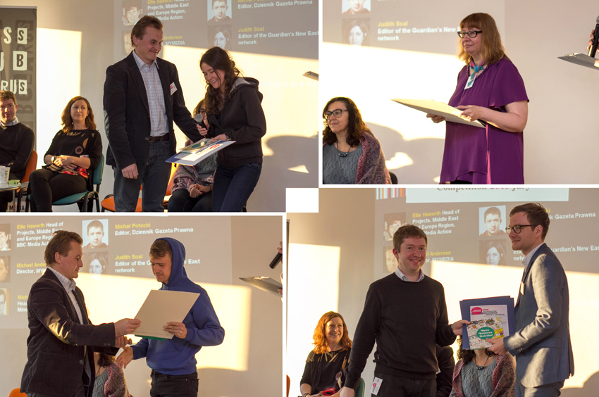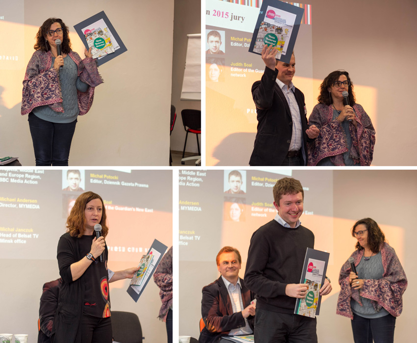 «Я хочу поблагодарить членов нашего международного жюри, которые проделали огромную работу по чтению и оценке всех 71 статьи, которые пришли к нам на конкурс», - взял слово координатор проектов Belarus in Focus Антон Рулев. В жюри нынешнего года вошли Майкл Андерсен, директор проекта MyMedia, Джужит Соал, редактор сети New East Network, The Guardian, Элли Хэворт, руководитель проектов в регионе Ближнего Востока и Европы, BBC Media Action, Михал Потоцки, редактор, Dziennik Gazeta Prawna и Михась Янчук, экс-руководитель минского офиса телеканала Belsat. Затем присутствующие на церемонии награждения члены жюри рассказали, какие работы они особо отметили. Рекомендации о том, как стать призером конкурса Belarus in Focus читайте вскоре на Mediakritika.by