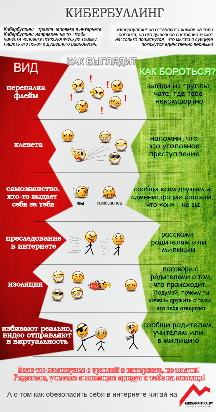 Mediakritika.by разработала памятку для детей и родителей о том, каким бывает кибербуллинг и что нужно делать, в случае если ребенок столкнулся с ним в интернете.