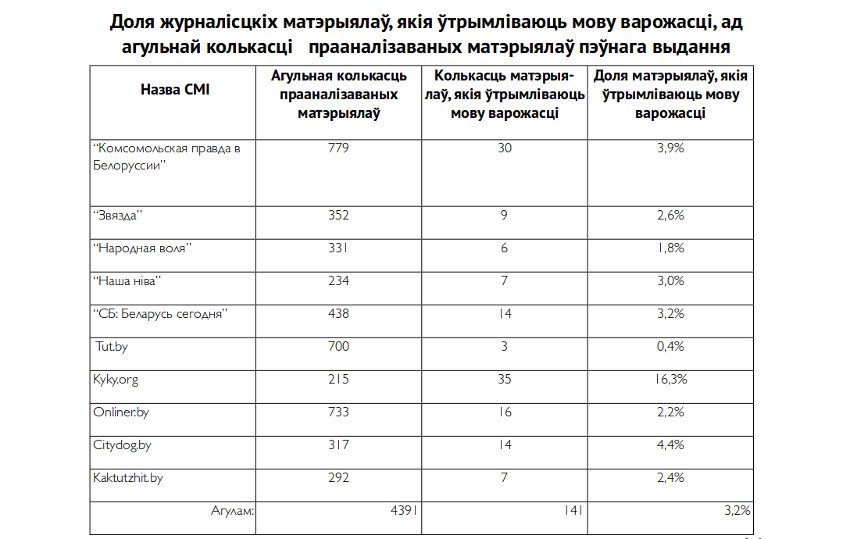 В авторских материалах на портале Tut.by за указанный период язык вражды встречается всего три раза: две публикации посвящены событиям в Украине, а одна представляет собой отзыв белорусского журналиста на его опыт жизни в Нью-Йорке. Следует отметить, что исследование не охватывает материалы, опубликованные в тематических разделах (lady.tut.by, realty.tut.by), а также публикации других изданий, перепечатанные в разделе «Новости».