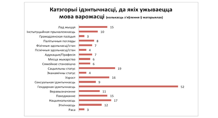 На основании масштабного ислледования, полный текст которого, можно найти здесь, наиболее распространенными способами использования языковых средств в качестве языка вражды в отношении категорий гендерной и сексуальной идентичностей (конструирование гендерного субъекта) в беларусских СМИ оказались следующие: