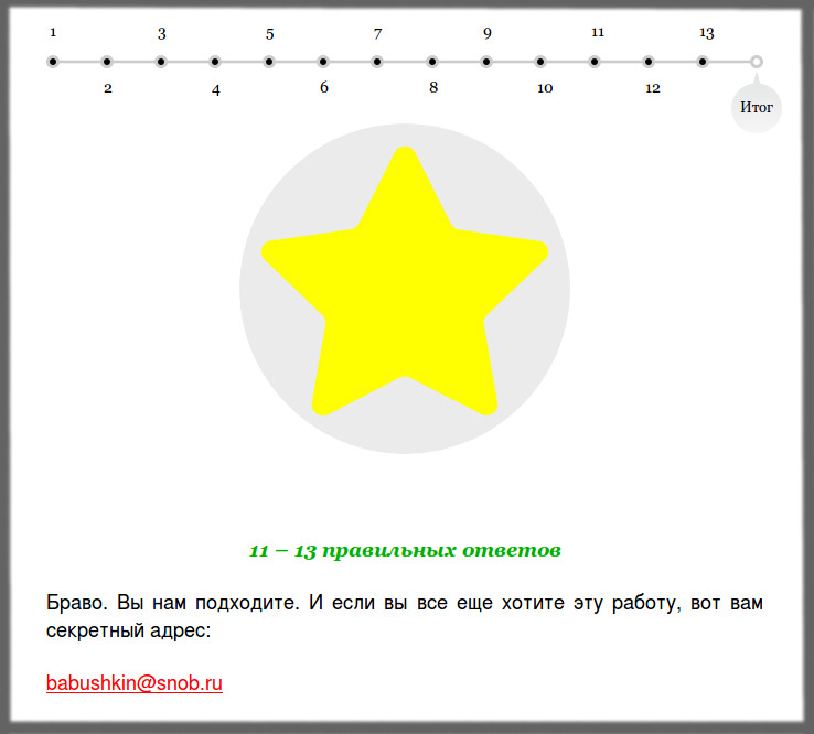 Несколько дней назад проект «Сноб» объявил о свободной вакансии редактора новостной ленты. И сделал это в довольно необычной форме. По ссылке «Сноб» ищет редактора: пройдите тест и приходите к нам работать соискателя ожидает онлайн-тест, который становится первым этапом на пути к заветной должности. Если правильно отвечаете на 11-13 вопросов, получает 'секретный' e-mail, на который нужно отправлять резюме.