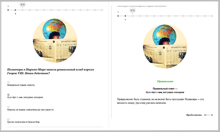 Для человека, который хорошо разбирается в журналистской и редакторской кухне, немного в правилах SEO-оптимизации и знает, как правильно работать с источниками информации, вопросы теста сложными не покажутся. Например, на «Почетный гражданин Салехарда споткнулся о камень и умер. Наши действия?» варианты ответов: Немедленно пишем новость; Пишем новость с комментарием администрации Салехарда; Новости мало, тут нужен некролог и Уходим на обед. При прохождении теста следует принимать во внимание, что вы должны отвечать так, будто уже являетесь редактором международного (!) проекта «Сноб». Поэтому в вышеприведенном примере правильный ответ — уходить на обед.
