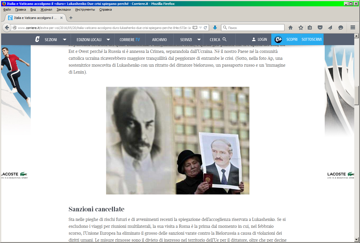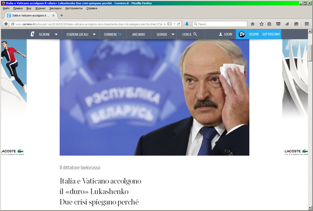 Такие крупные итальянские издания, как La Repubblica и La Stampa приезд Александра Лукашенко просто проигнорировали. Как показал простейший поиск на их сайтах, последний раз глава Беларуси вообще упоминался ими в конце 2015-го, в связи с вручением Нобелевской премии Светлане Алексиевич. Более того, о приезде Лукашенко не было сказано ни слова в открытой ленте крупнейшего итальянского информагентства ANSA – там последняя новость с упоминанием белорусского президента – это сообщение о февральском визите Путина в Минск.