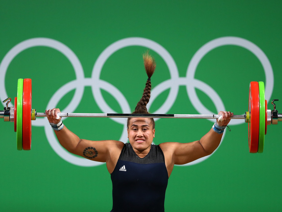 Луиза Петерс, спорстменка с Островов Кука, поднимает штангу в весовой категории до 75 кг