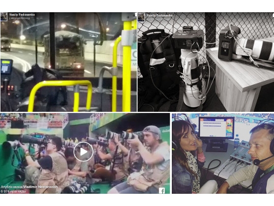 Фотограф Thomson Reuters Василий Федосенко показал меры безопасности, принятые в Рио: грузовик с солдатами, сопровождающий автобус, привязанные тросиками к ограждению фотокамеры, борьбу с комарами-переносчиками вируса Зика, а также отдых коллеги за 5 минут до очередного матча.