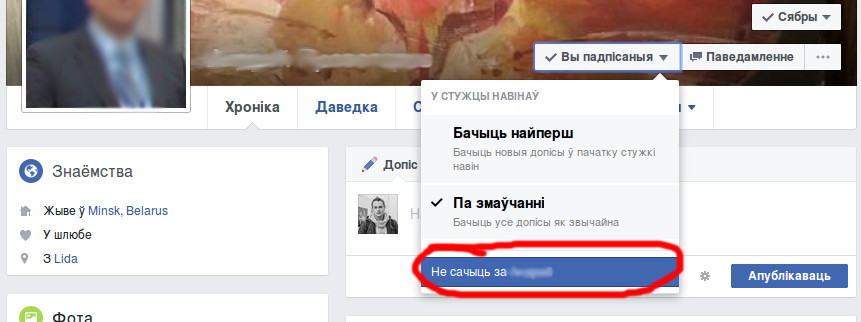 Бывает такое, что вроде бы и человек неплохой, но пишет неинтересные вам посты, чем создает лишний информационный шум. Как сделать так, чтобы не обидеть человека? Просто отписаться от его обновлений. Заходим на страницу пользователя и в шапке находим слова «Вы подписаны». Далее нажимаем «Не следить» и дело сделано.