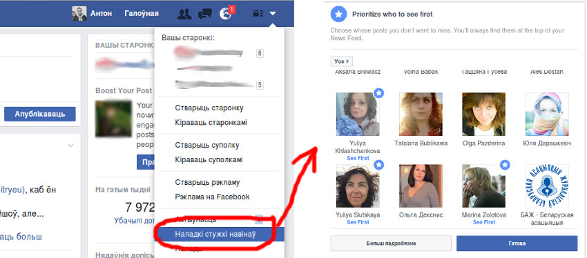 Наконец, когда мы разобрались со всеми нежелательными постами в своих лентах и прочим информационным шумом, самое время сообщить алгоритмам Facebook'а, что же мы хотим видеть в своей ленте. Здесь также существуют два варианта. Первый — приоритет выдачи в ленте новостей. Для этого в кажимаем на стрелочку в самом верху справа FB, в выпавшем меню выбираем «Настройки ленты новостей». И расставляем свои приоритеты: