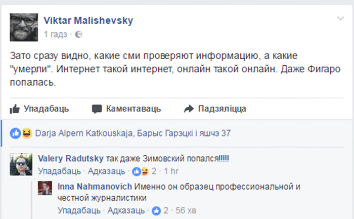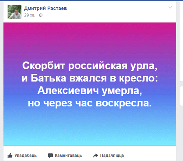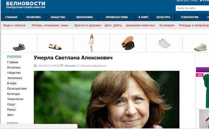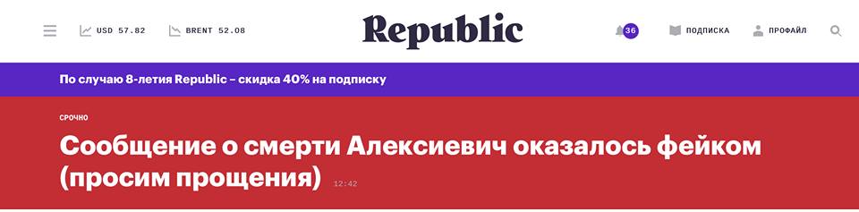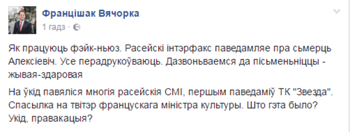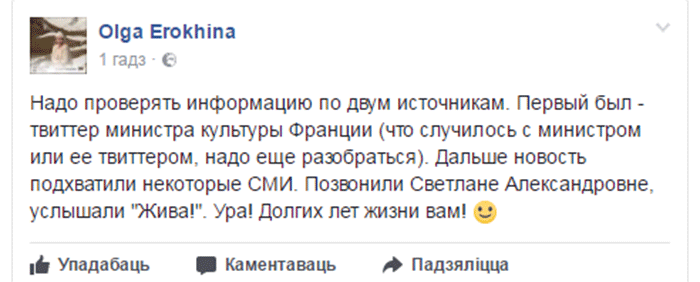 Беларусские медиа в подавляющем большинстве своем на провокацию не поддались. Возможно, причиной того стало наличие прямого контакта журналистов с нобелевским лауретом. Звонки на мобильный Алексиевич подтвердили, что с первым беларусским нобелевским лауретом все в порядке. Писательница жива, здорова и получает очередную литературную премию в Сеуле.