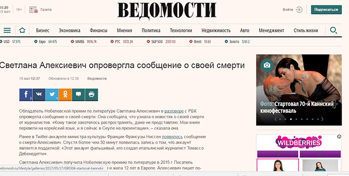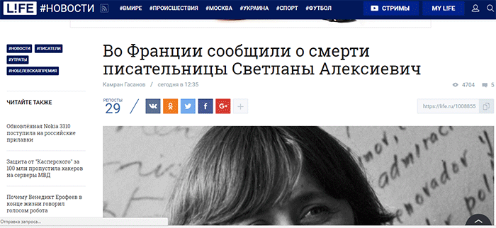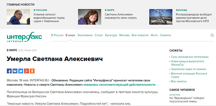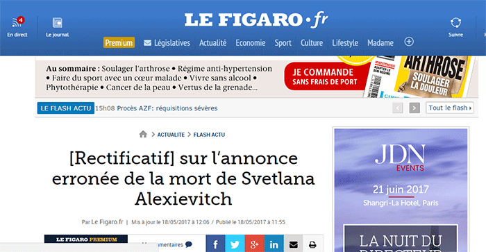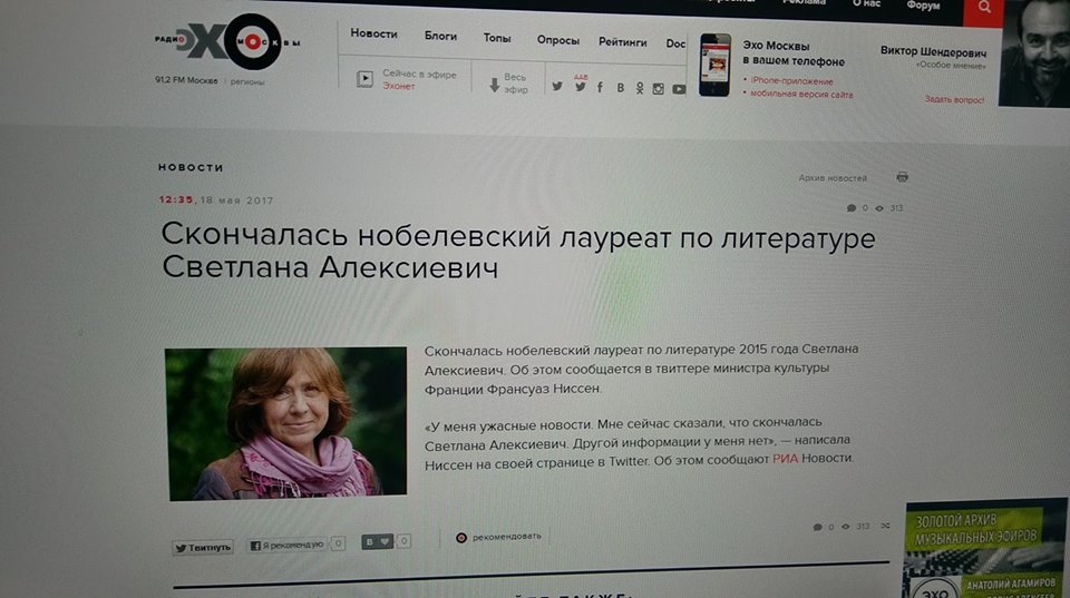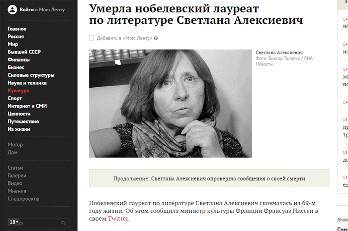 Французские и российские медиа «похоронили» Нобелевского лауреата по литературе Светлану Алексиевич. Медиа потребовалось около часа, чтобы понять, что они допустили ошибку.