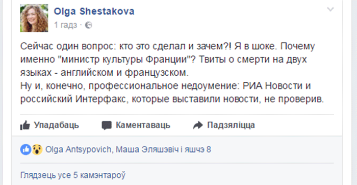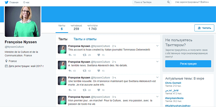 Все началось с твитта от якобы министра культуры Франции Франсуазы Ниссен, в котором она сообщала «ужасную новость». Позже, впрочем, выяснилось, что эта учетная запись – мистификация, созданная итальянским журналистом Томмасо Дебендетети.