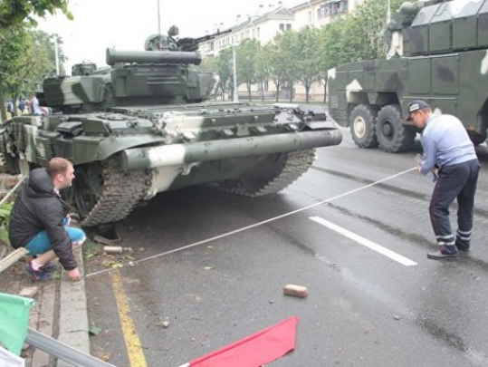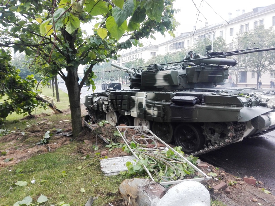 «Советская Белоруссия» объяснила своим читателям, что танк Т-72Б ехал по проспекту Независимости и «в какой-то момент он снес в фонарный столб и врезался в дерево», поспешив успокоить сограждан тем, что уже «принят дополнительный комплекс мер, проведены дополнительные инструктажи и уроки по обучению механиков-водителей специфике вождения в городских сложных погодных и дорожных условиях». А заодно и дав оценку действиям «мужчины за рулем», которые «помогли исключить более серьезные последствия». При  этом главная газета страны уверяет, что «скорость транспортных средств во время прохождения на параде не превышает 20 километров в час». И это «гарантирует безопасность и помогает избежать возможность таких происшествий».