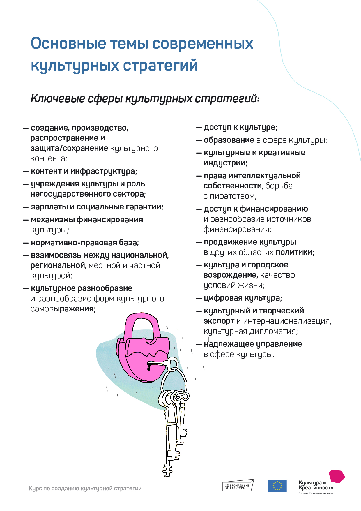 Культура делает жизнь интересной и придает «вкус» повседневности. Как системно и эффективно включить культурную составляющую в будни организаций, бизнесов и государственных органов? Впервые, коротко и четко о культурных стратегиях рассказывает Рагнар Сиил, в прошлом зам. министра культуры Эстонии, а теперь - один из руководителей программы ЕС «Культура и Креативность», в своем курсе «Культурные стратегии».