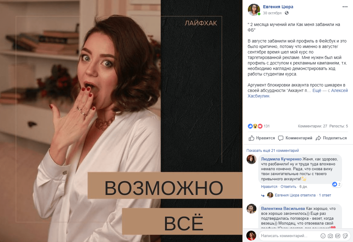 От редакции: Вопрос на самом деле важный. Очень многие осознают свою привязанность к Фейсбуку, особенно в плане бизнеса, только после блокировки. Поэтому тот, кто предупрежден, тот вооружен. Совершенно недавно заблокировали аккаунт Евгении Цюры.