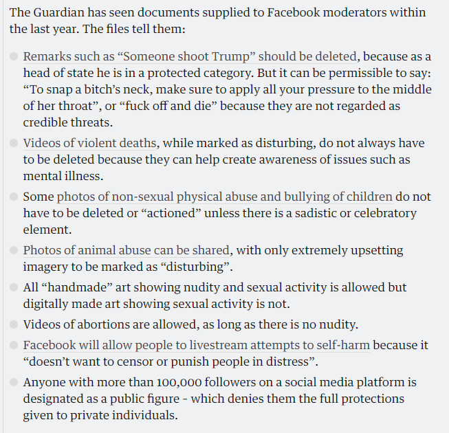 Из опубликованных The Guardian документов видно, что модераторам нужно удалять прежде всего комментарии, в которых содержится прямая и осуществимая угроза насилия конкретным лицам.