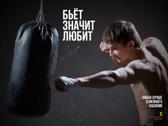 Об избиениях порой говорят «он молотил её как боксёрскую грушу», «он превратил её лицо в фарш». Так что плакат с боксёрской грушей и подписями «бьёт значит любит» и «хобби лучше семейного насилия» - это крайне сомнительный способ высказаться против собственно семейного насилия.