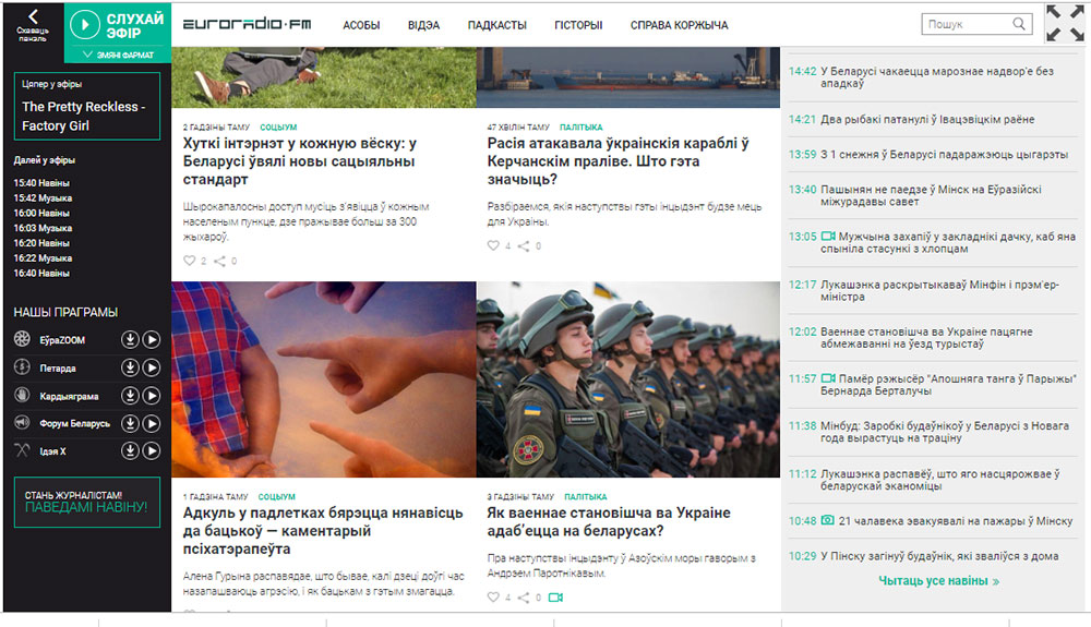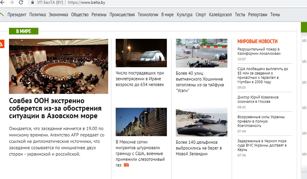 На сайте «Белтелерадиокомпании» можно найти новости о закрытии и открытии для гражданских судов Керченского пролива, а также о том, что Россия срочно созывает заседание Совбеза ООН.