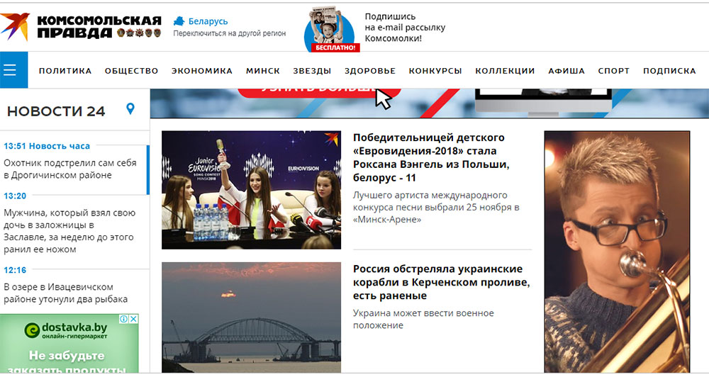 «Комсомольская правда» в Белоруссии» в утреннем материале про события в Керченском проливе дала две версии случившегося – кремлевскую и киевскую. Новость о том, что Россия обстреляла военные корабли Украины попала на главный экран. И оставалась там до обеда 26 ноября.