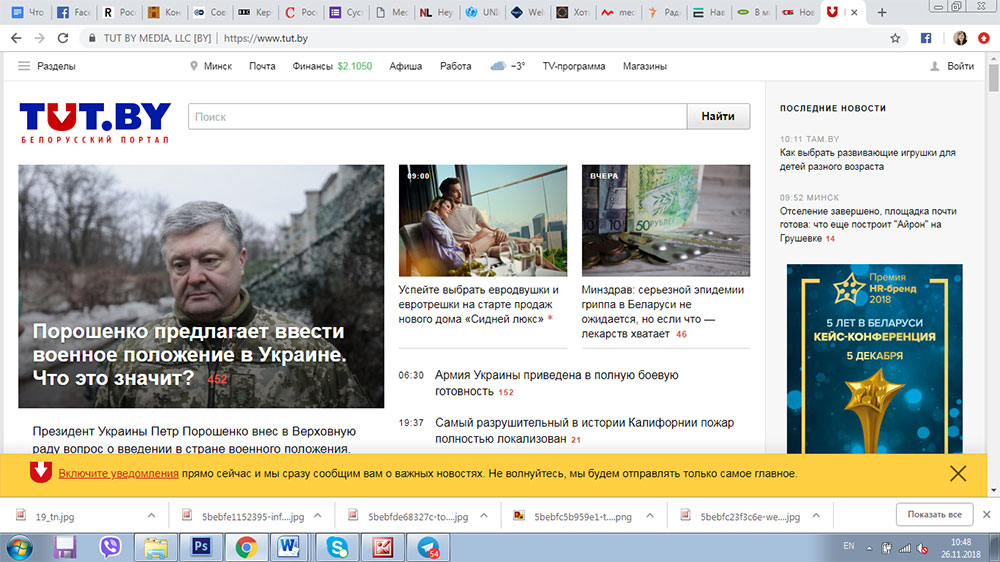 Портал TUT.by ночью 26 ноября разместил главной новостью материал про возможное введение в Украине военного положения. До этого, начиная с 15.14 воскресенья, портал постоянно обновлял новость о случившемся в Керченском проливе, в которой мониторил официальные заявления обеих сторон, посты в социальных сетях важных государственных чиновников России и Украины.