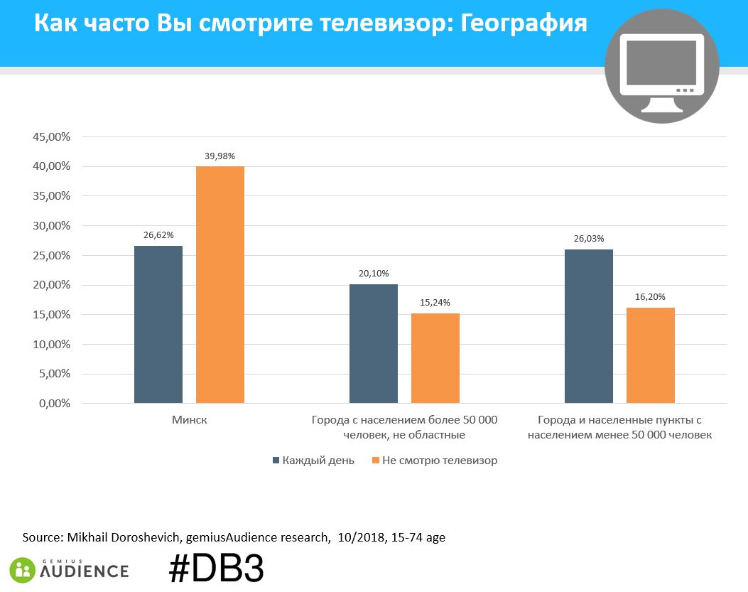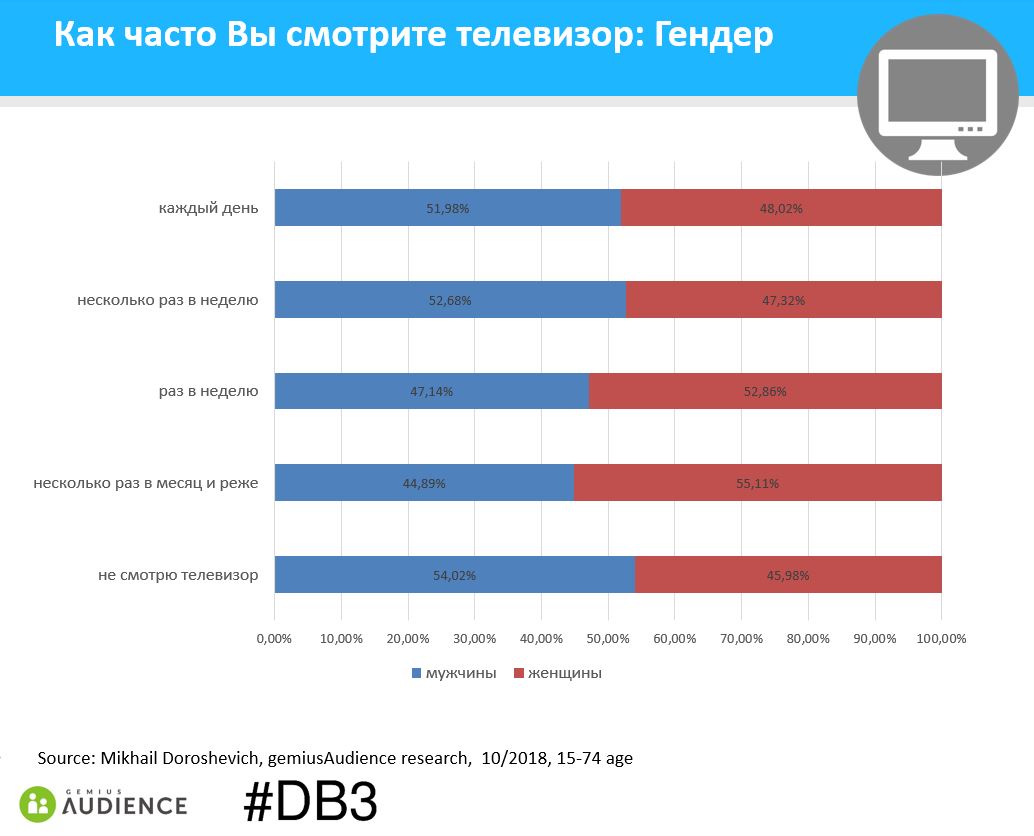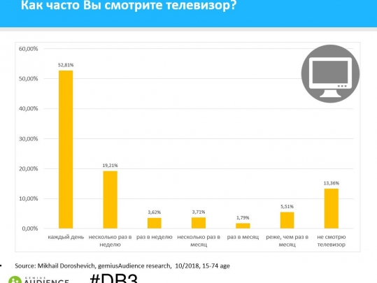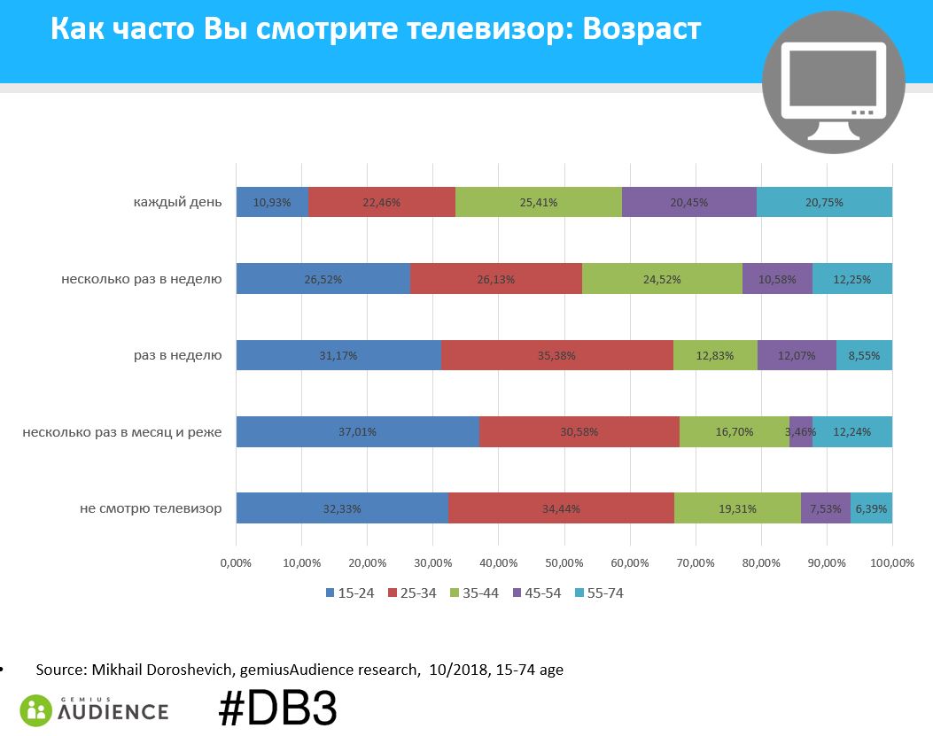 С апреля 2018 в медиаисследовании gemiusAudience, проводимого в Беларуси по инициативе исследовательской компании #DB3, публикуются социально-демографические данные о частоте смотрения телевидения беларускай интернет-аудиторией.